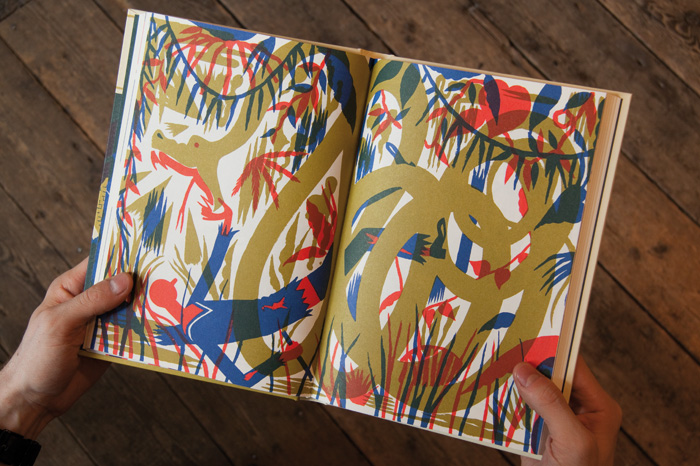 It would be unfair to say the prose is an afterthought, but our eye is drawn to the images for a reason. Nobrow’s press materials argue that Blexbolex’s style recalls the natural fluidity of Matisse, but except for the decorative elements similar to what you might see in Landscape at Colliourre or Blue Nude, I’m not convinced. The silkscreen overlays and limited palette in No Man’s Land create a more complicated and severe world, one that combines Matisse’s Fauvism with surrealism’s severity and the shock value of 1930s WPA posters, which is to say a bit of Expressionism. Each of Blexbolex’s pages demands that you linger and interrogate, be it a simple landscape or the narrator’s frenetic duel with what might be an anaconda. The sense which might be made of these images is always leavened, even trumped, by their surprising, powerful intricacy.