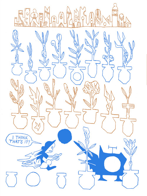 The art in Distance Mover is simply beguiling. Kyle has developed an idiosyncratic visual language that marries base juvenilia with brilliantly intuitive page design. It’s fantastic. Of course, that’s a subjective position, and one I’m sure many would disagree with, as Kyle’s is an undeniably peculiar aesthetic. Even so, it’s hard not to admire how much Kyle can do with two colors, a white page, and an amorphous illustration style nearly devoid of depth. I mean, Kyle’s renderings—of his characters and setting, both—are not dissimilar to inkblots (or the outlines of inkblots), his pages devoid of standard paneling (meaning there’s no formal delineation between the moments/scenes depicted on a given page), and yet somehow Distance Mover not only reads fluidly, but ravenously. It’s a testament to Kyle’s keen design sense and masterful control of every square inch of his book. It’s this equation—flat dialogue plus flat illustrations—that, in its alchemy, turns Distance Mover into what it is, transforming an otherwise middle-of-the-road sci-fi epic into something overflowing with humor, invention, and, wouldn’t you know it, heart. Distance Mover is a terrific book, marking Patrick Kyle as a standout among up-and-coming cartoonists.