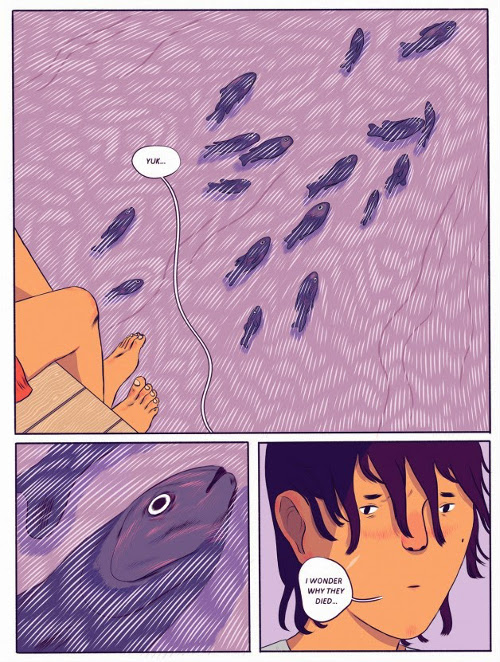 Fish tells the story of twelve-year-old Milo, a young boy living in the shadow of his parents’ death on the French Rivera. Awash in a multi-hued pink-purple summer, Bagnarelli gives ample space to Milo’s quiet grief, adding a formal sensitivity to the work through her gorgeously fluid line work and masterful use of color. With expansive, often textless panels, Milo roams about, mostly silent, having awkward interchanges with his cousins and witnessing various iterations of death. The narrative culminates with the news of a local girl found drowned on the beach. What’s impressive here is that Bagnarelli, even in the face of such enormous themes—mortality, adolescence, loss—never fails to be nuanced and incisive, allowing a wide breadth of illustrated emotions to stand on the strength of her illustrations. The story is complex and powerful—and sharpened by the delicacy with which Bagnarelli meets every page. Fish is a great introduction to one of the most promising talents on the scene.