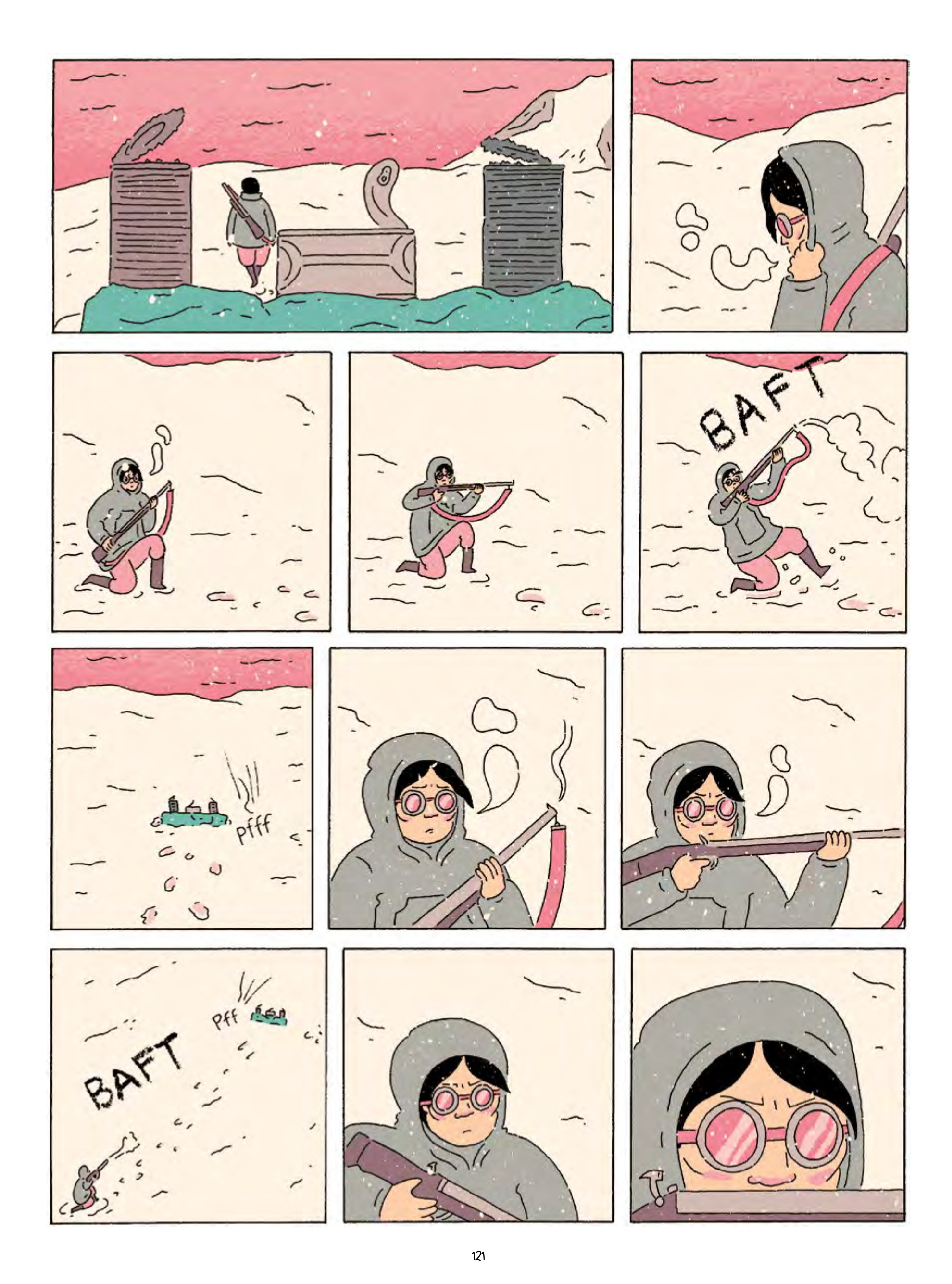 We first encounter Ada in 1921 as she rummages through a seemingly abandoned camp beneath a stark red sky. When Ada finds her lost cat, Vic, a small, relieved smile creeps across her lined face. But her joy is short-lived. With a menacing “MOOAARR” that hangs in shaky black letters above Ada’s head, the source of her own troubles is revealed: a polar bear in the camp, towering over her tiny frame. Ada’s inclusion in the text is a tricky one. The real Ada Blackjack lived a hard life, and she returned from the Wrangel Island expedition to find her tale of perseverance and survival exploited in a media circus, her rescuers profiting off her story while she continued to live in hardship. Healy does not exploit, however, but rather empathizes with this Inuit woman trapped in an increasingly white world, doing what she can for her ill son. Meek, small, and constantly worried, Ada is hired onto the expedition as a simple seamstress. However, as the expedition gets trapped on Wrangel Island, she transforms herself into a fierce and capable survivor. In a story filled with inspiration and heroism, few images stand out: Ada wears snow goggles red as the Arctic sky, clutching a rifle as big as her body, brow furrowed in defiance of her own meek spirit.