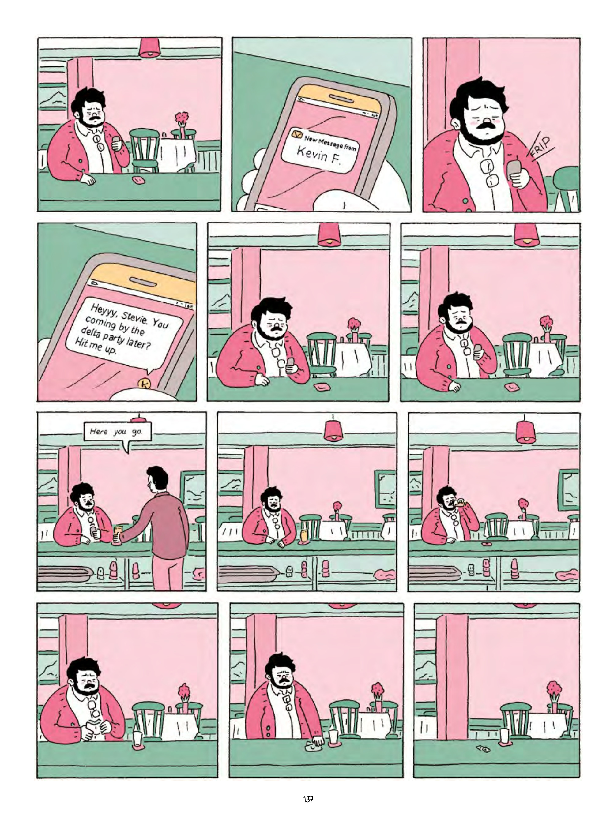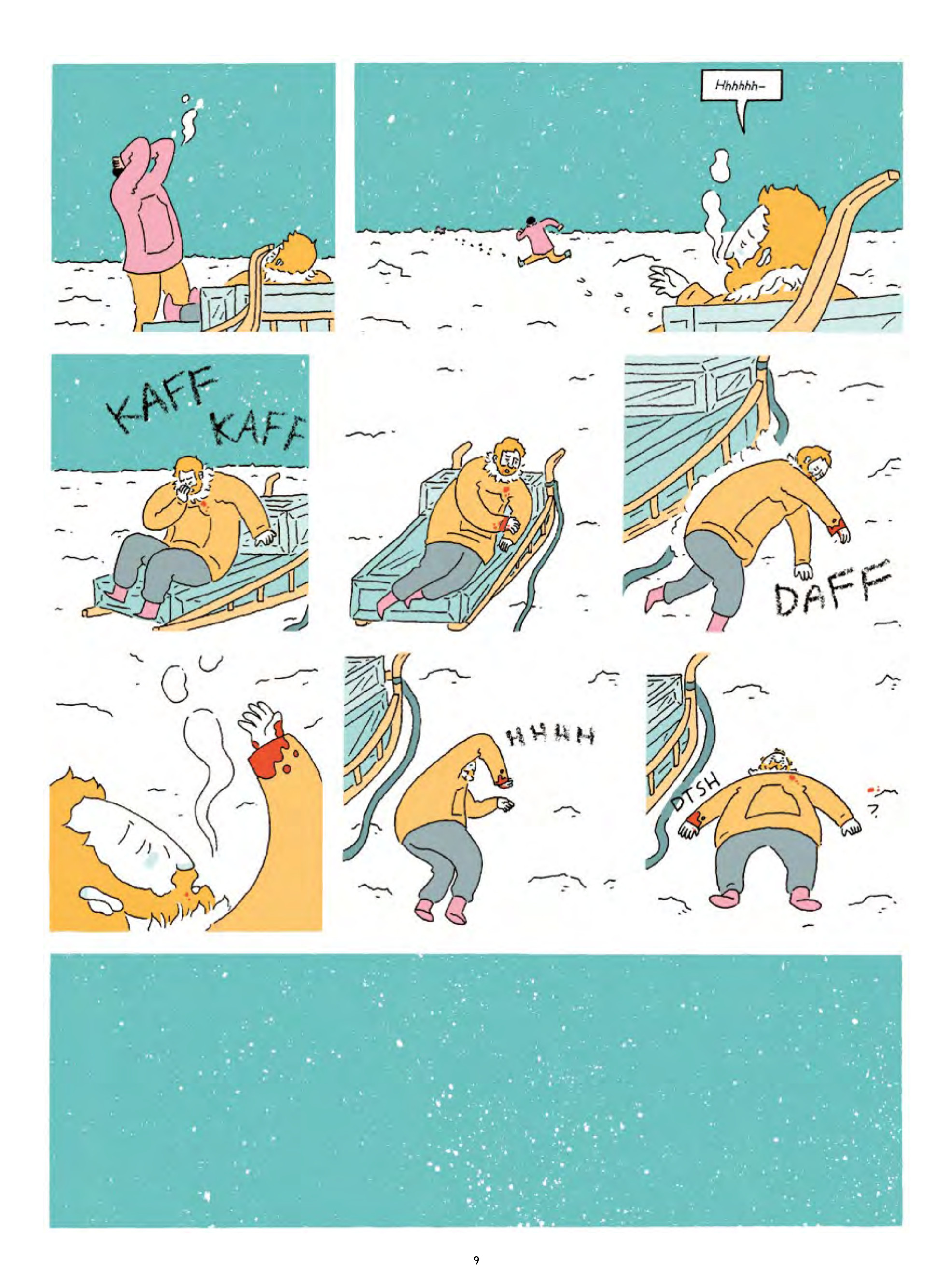 Through it all, Healy’s skill as a cartoonist sings. Rendered in soft but striking pastels, Healy’s art displays a certain charm normally reserved for children’s book classics, simple and gratifying and utterly remarkable in its economy. Still, this is no children’s book, and Healy’s art also displays a rugged minimalism that never fails to convey the stark situation of the book’s protagonists. Whether it is Bartlett slumped on the hard ground in a pool of his own blood or Sully laying on his couch amidst the materials of his depression, Healy uses comics conventions to stunning effect. Characters’ breath fogs up visibly before them, serving not only as a constant reminder of the bitter cold, but also playing at speechlessness and deafening silence, each frozen breath resembling a shriveled, empty speech balloon. Sound effects don’t just offer sound, but take up space within the panel themselves, so that the staccato “KAFF KAFF” of a dying man’s cough almost threatens to crush Ada Blackjack as she tries to sleep in her tent, and leaves an unbearable emptiness when it suddenly stops.
