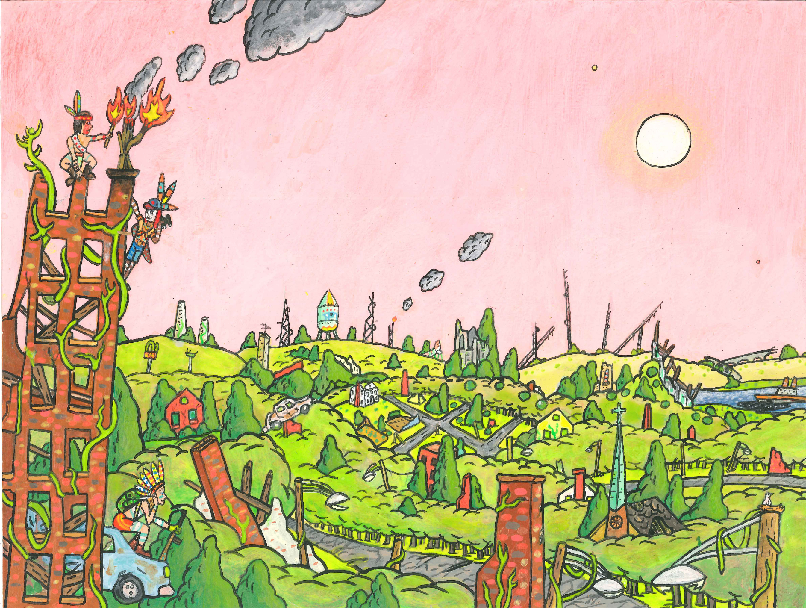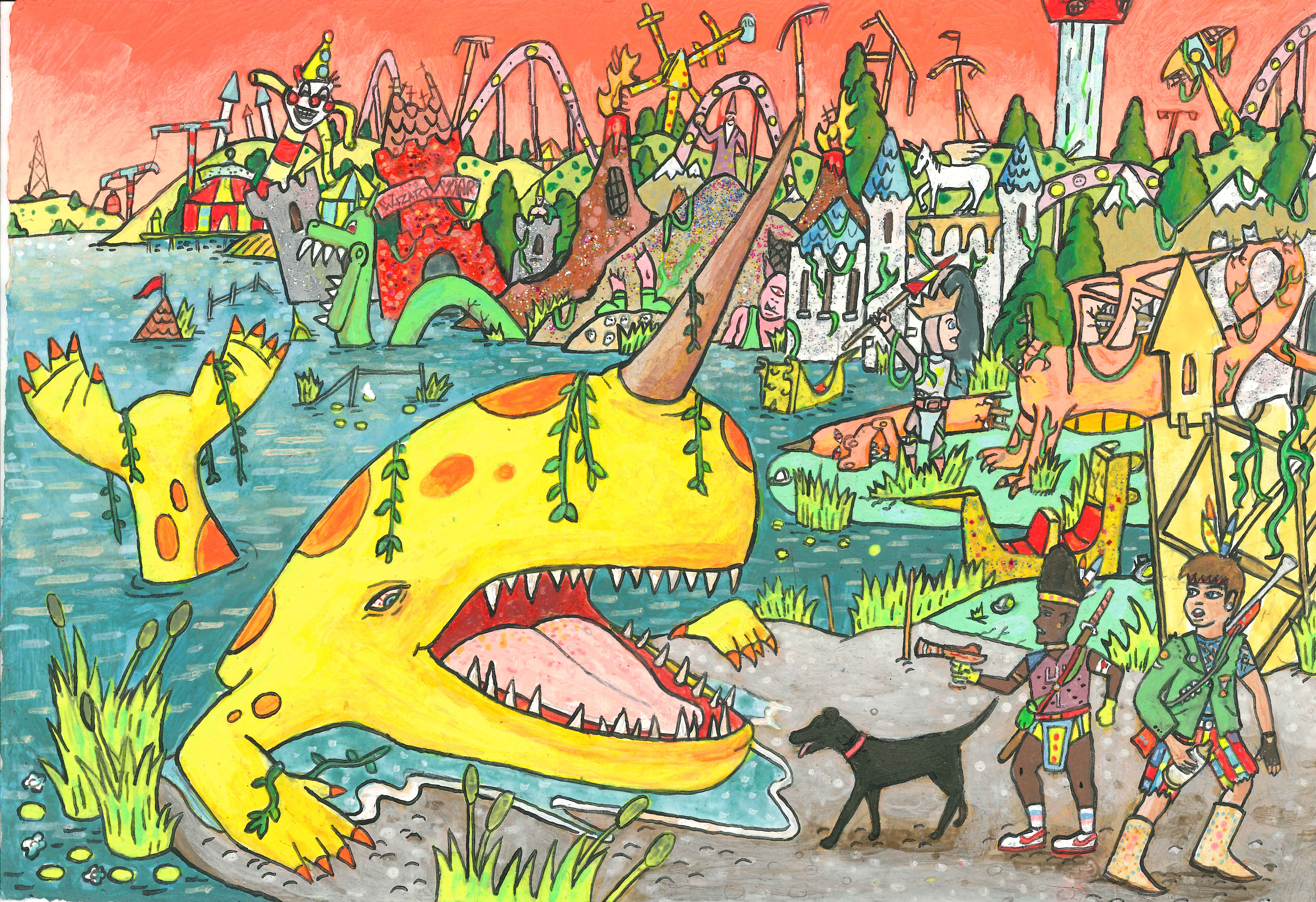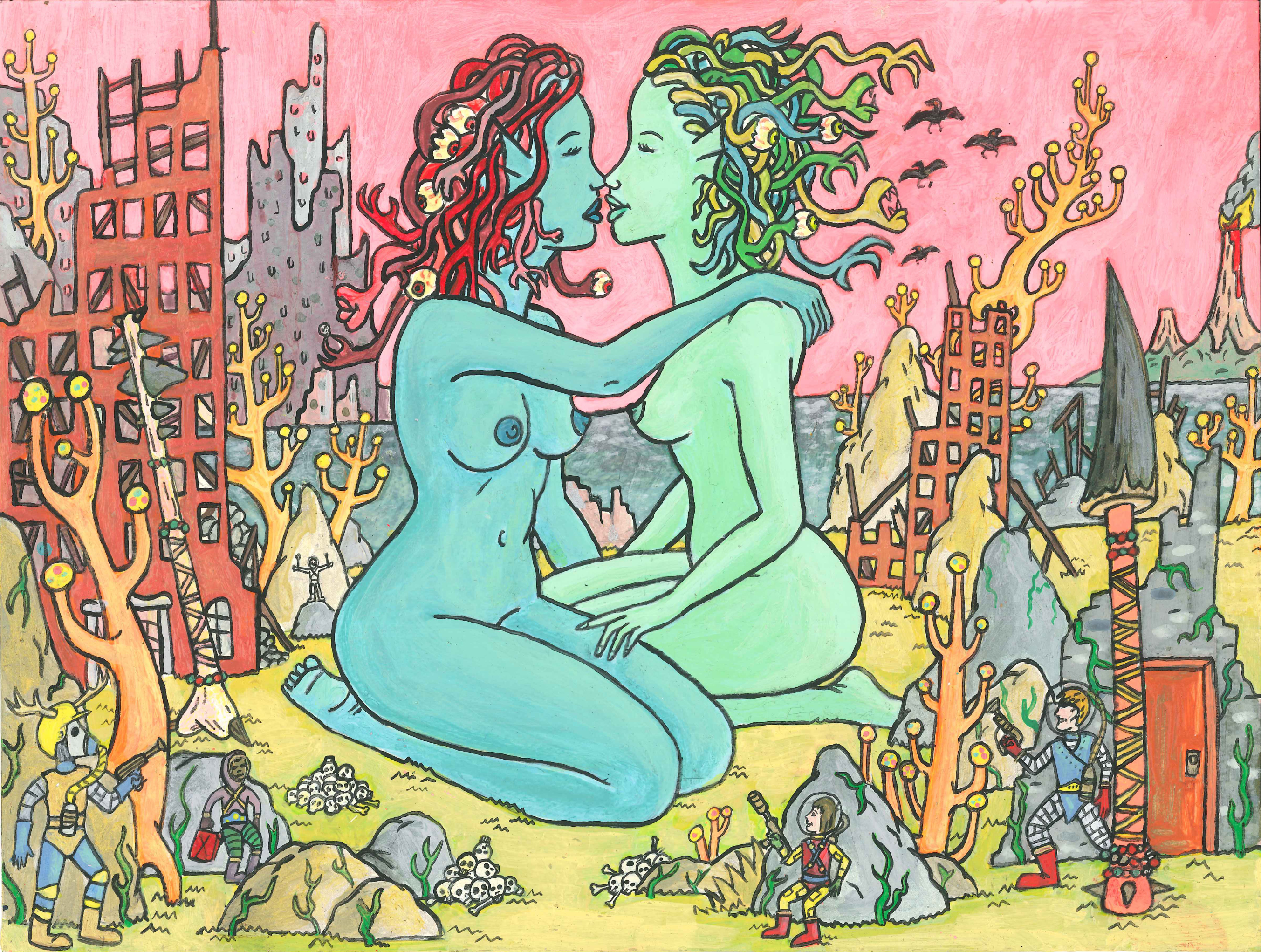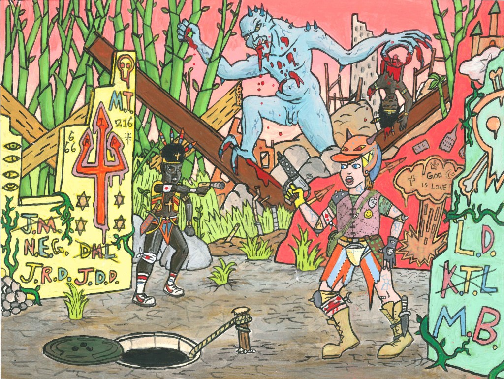 A native of Cleveland, Ohio, Jon Read is a graduate of Kent State University. His style is influenced by visionary folk art and neo-expressionism. His paintings portray a strong narrative, telling stories heavily influenced by comic books, cult films, science fiction, mythology and religion. On the performance stage, he is also known as The Wiggins, a one man band crafting music that has been said to have an “end of times” sound, fusing rockabilly guitar riffs, punk rock overdrive, and heavy hip-hop beats. He currently lives in Houston, Texas.
