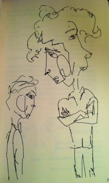 Buleri’s drawings remind me of the iconic illustrations by Ralph Steadman, the esteemed British caricaturist, whose energetic line drawings so wonderfully captured the frenetic energy in Hunter S. Thompson’s classic Fear and Loathing in Las Vegas. However, the spirit of their work is quite different. Steadman is a trenchant satirist whose visual art skewers political figures and societal norms. Buleri’s drawings are much lighter in emotional tone, and infused with a sprightly innocence. They serve as a lighthearted complement to Smith’s unrestrained verbal musings that read in the same loose kind of way.