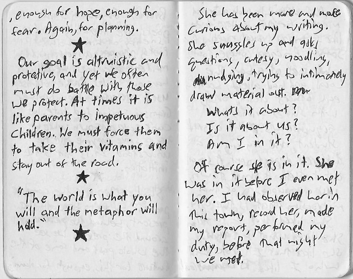 But she does hope to understand it. She asks about my book. She wants it to be, to come to life, into existence. I will produce it for her, and for my destiny. She will learn of me through it, no matter how fantastic the tale. The art of the Shadow Men reveals as much as it conceals. It is part of our way, our assistance, the duty. She will have some reveals just for her, my wit, my erudition, my prose conjuring pathos and glimpses of humanity in the raw out of mere words on the page.