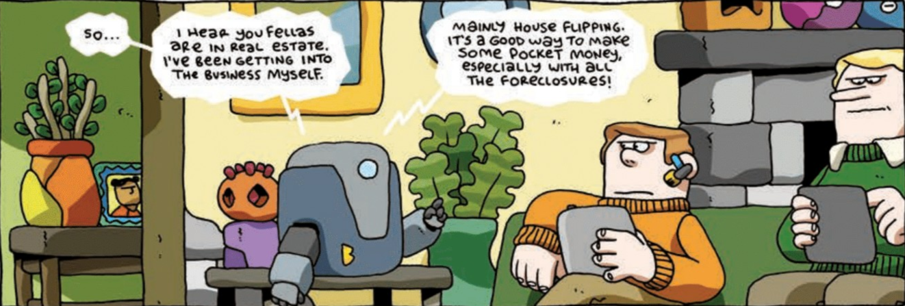 But just as we start exploring these issues surrounding gentrification, House of the Black Spot transforms into a murder mystery. Someone has killed one of Gear Town’s most beloved citizens. Plus Man and Hank, along with their new friend Mel, must investigate. The most likely culprits are two greedy businessmen and one greedy businessrobot, who stood to gain valuable real estate in the case of the victim’s untimely death.