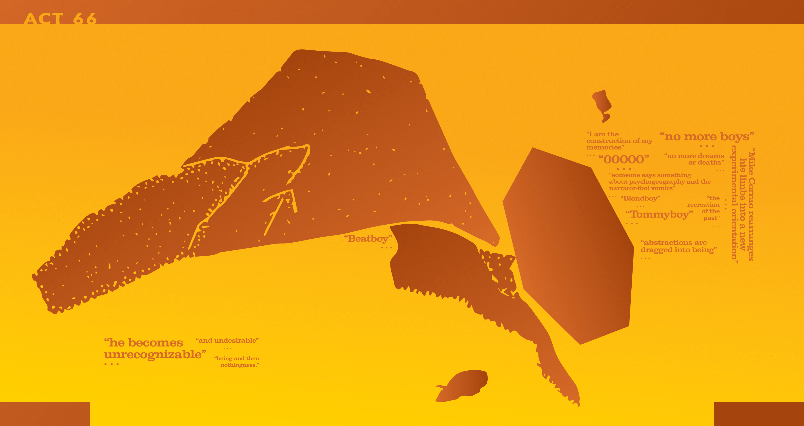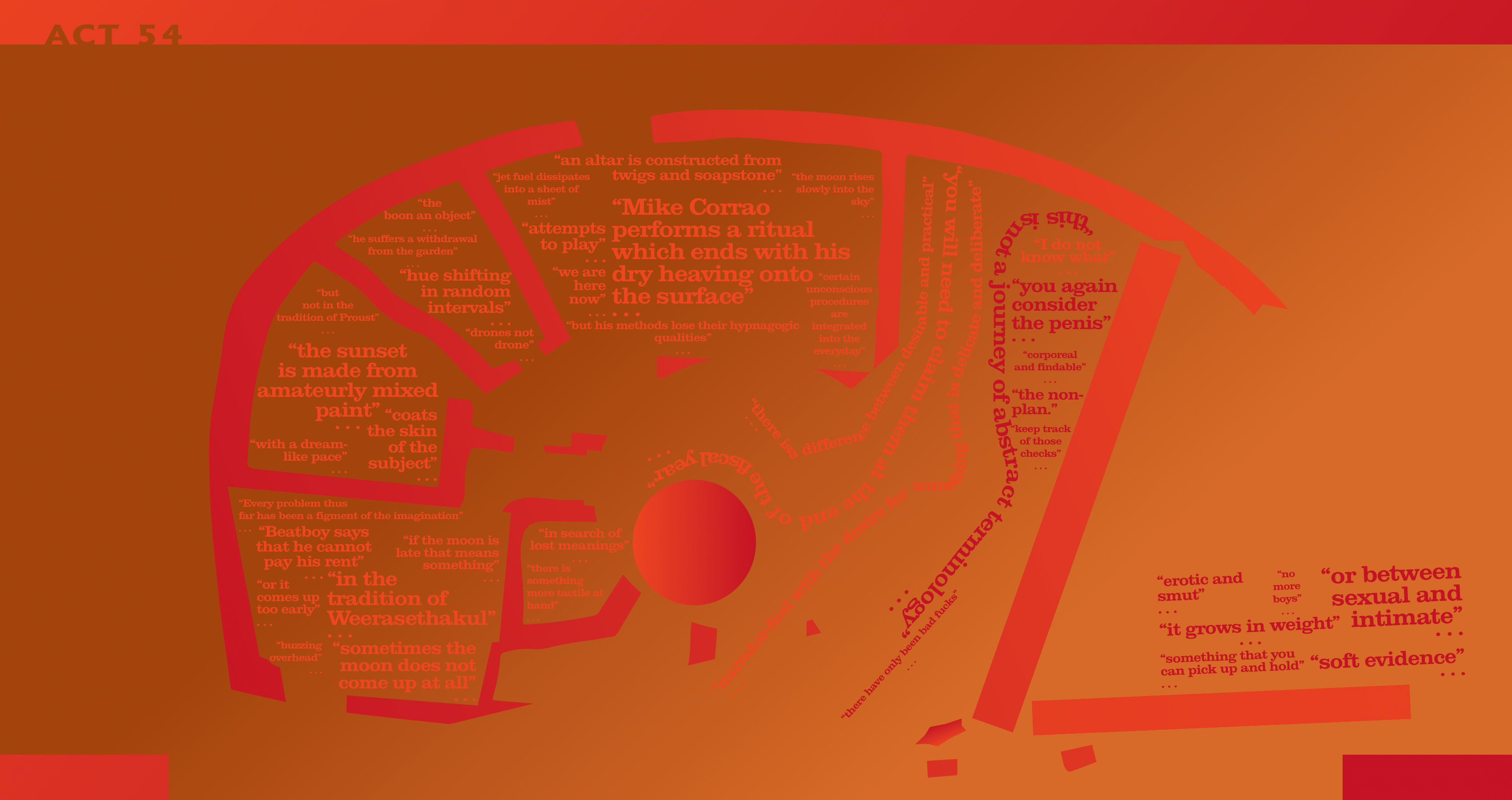 I am Mike Corrao, a writer and multimedia artist, and I live in Minneapolis. I am the author of two novels, MAN, OH MAN (Orson’s Publishing) and GUT TEXT (11:11 Press), and I also wrote one book of poetry called TWO NOVELS (Orson’s Publishing). I have written two plays, SMUT-MAKER (Inside the Castle) and ANDROMEDUSA (Plays Inverse, forthcoming), and I have two chapbooks available, AVIAN FUNERAL MARCH (Self-Fuck) and SPELUNKER (Schism – Neuronics) … My books often explore the haptic, architectural, and organismal qualities of the text-object … You can learn more about me at mikecorrao.com … My new book / blocking diagram / set design document / lighting script, SMUT-MAKER, was just released by Inside the Castle, a small press operated from Lawrence, Kansas. From their website: “Our books are unique from one another but share a vision, that literature is not representational but incantatory, that books are objects that exist much like other objects in your life and home, only they have additional dimensions, not dimensions separate or distant from the ones you occupy, but involuted dimensions that only become apparent when you reach out to them” … So I reached out to my publisher, John Trefry, to see if he’d be open to doing a kind of examination of the design process for SMUT-MAKER. I thought it’d be fun to see his notes for a few of the 72 acts and what kind of logic guided his design in certain places … John and I ended up having a few hours of overlapping free time so we wrote up a conversation in Google Docs. Check out the fruits below.