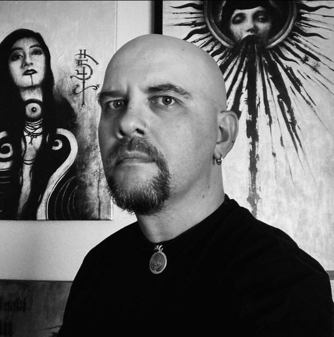 BD: I am working on surviving uncertain times. We all are. I am plucking away at a bunch of different things. Currently, I have a few paintings in progress, still in the chosen lane that I’ve been in for about a year—kind of a minimal greyscale/metallics palette with a dark sci-fi/pre-code film/metal kind of feel with some room for application style depending on my mood. Recent album [cover] releases from locals BleakHeart and Roäc and upcoming releases from UK/German friends Godthrymm, Darhk, and Iconostasis. An upcoming YouTube chat with Chain Reaction Records. I am also trying to be more attentive to the business side of things by learning the ropes with social media engagement and expanding sales—hoping to fill the void that came crashing in like a plague(!) on my newfound joy of popup art markets and meeting people in fun settings.