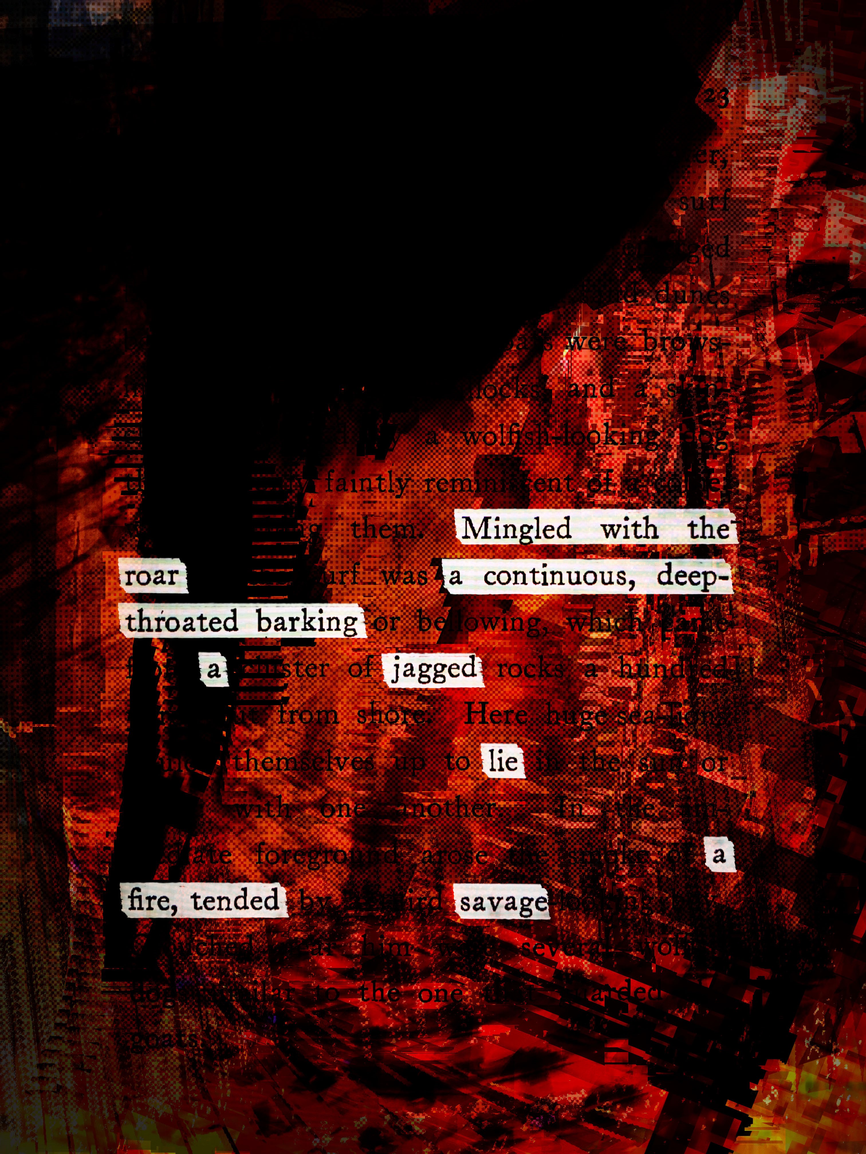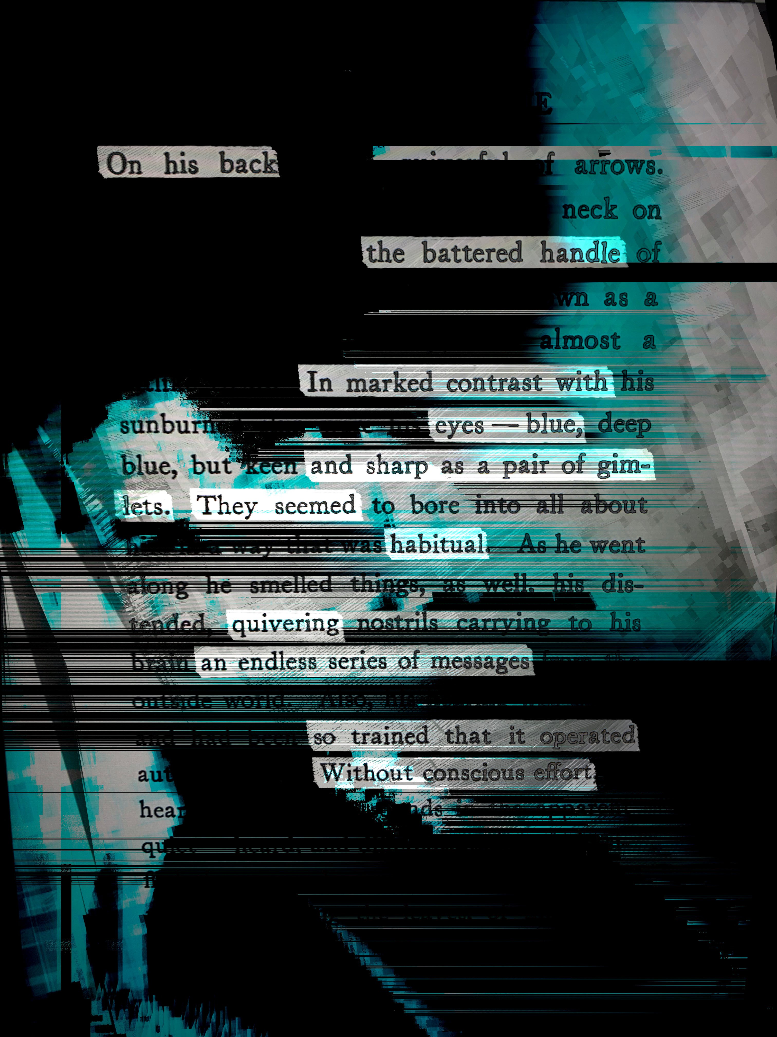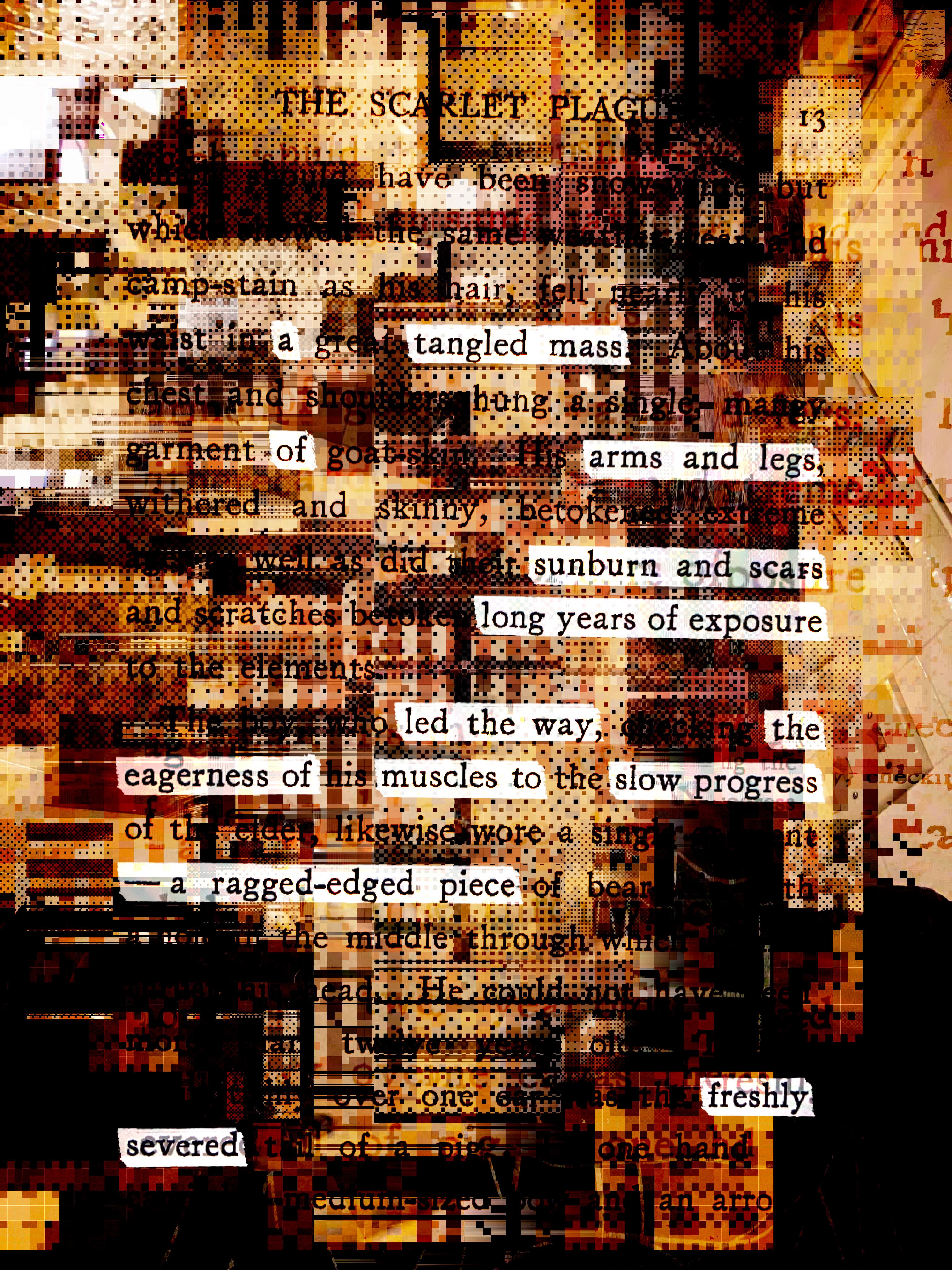 The digital/visual poems are created through erasure of the novel The Scarlet Plague collaged with glitched imagery from everyday life in lockdown. The titles of poems in the series are then derived from objects contained in each glitched still life.