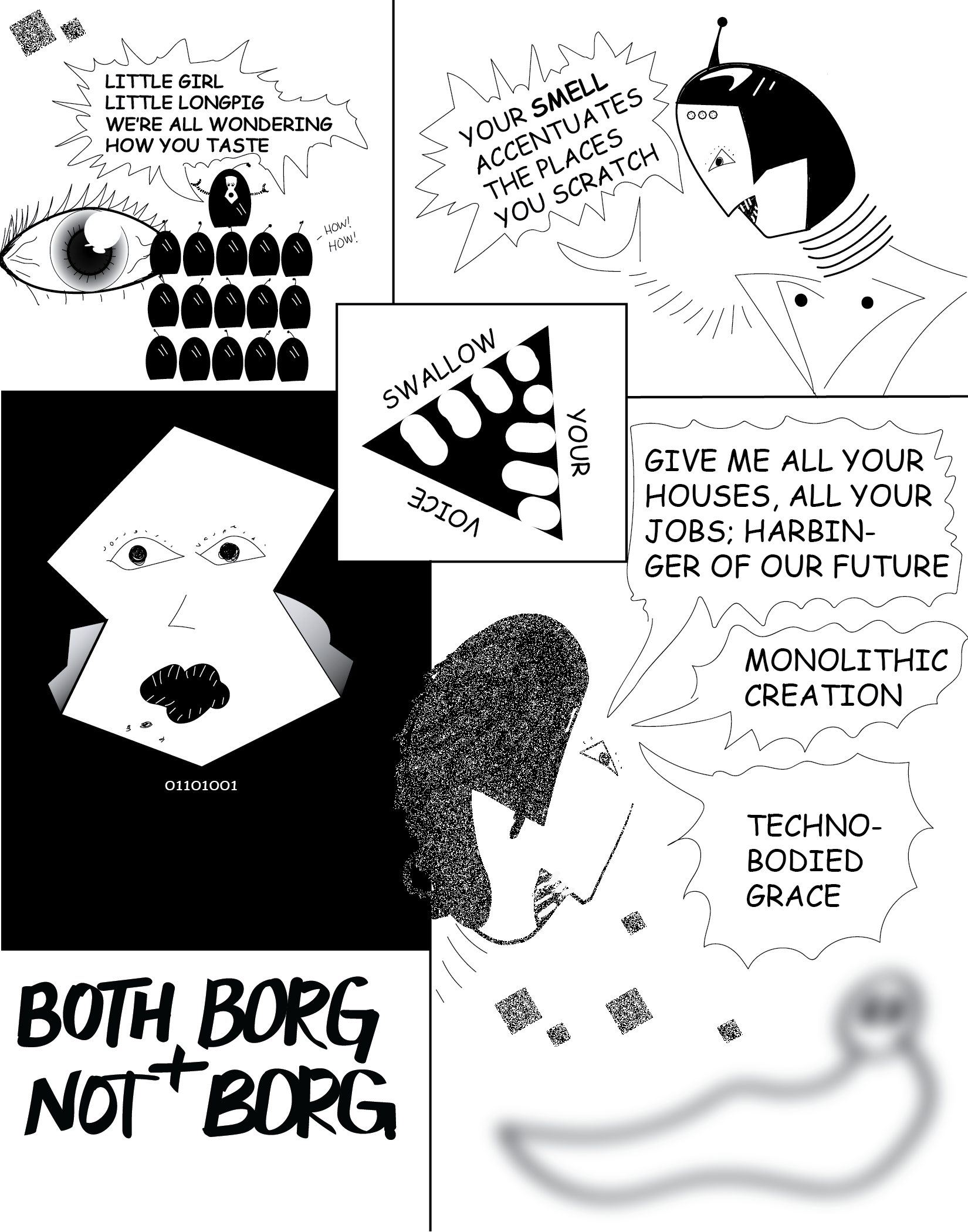 RB: Yes! This piece is part of a series of borg comics and poems I’ve been working on for a very long time. The series is autobiographical and speaks to my experience with invisible disabilities. I wanted to use the borg as a vehicle to convey the frustration associated with conformity and how conformity silences us. People with disabilities conform to a world that doesn’t value them every day. In that sense, there’s some borg that lives in me. There’s also some of what I’m calling “not borg.” Individuality, or the absence of borg, is “not borg.” It’s a constant negotiation between the two. Like I said earlier, as a child I couldn’t imagine a worse fate than having to assimilate into the borg collective. Now I realize how much I truly assimilate every day (at work, at school, at life) and the silence that accompanies that. This is why 01101001 (or “i”) never speaks. She simply fades away in the end as the borg take everything from her.