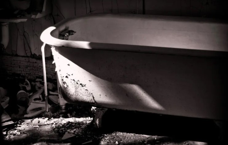 maybe she watches the current occupants from afar from around the corner. she watches the children play with little dolls with building sets. she watches a girl around her once age cry loudly alone in a room. maybe she watches a young man play a piano during nights. maybe she feels something for this man. maybe she feels less alone during these nights. she tries to sing to his tune. instead of a voice all that leaves her mouth is water. maybe her voice is but a leak. maybe she screams. more water falls from her open mouth silent in its spill. maybe she flees from the room. in flight maybe she returns that bathroom. this is the first time since the last time. maybe she is afraid. maybe she is furious. maybe she throws the glass soap bowl. it hits the window. maybe this feels good. destruction better than a piano tune. she throws the shampoo bottles. she throws the ceramic toothbrush holders. they burst pieces on the floor. she strikes the mirror. there’s the reflection of a thousand pieces of the same girl the same ghost falling. she pulls down the curtains. maybe she screams. shards and water mix onto the floor. maybe the family’s small dog comes into the room. he barks at her teeth bared and growling. maybe she grabs him. maybe her hand’s around his throat. maybe she squeezes too hard. his barks cease. maybe she drops him into the tub. maybe she screams again. or maybe she cries. maybe the family finds this mess. they can’t explain this mess. maybe they move out.