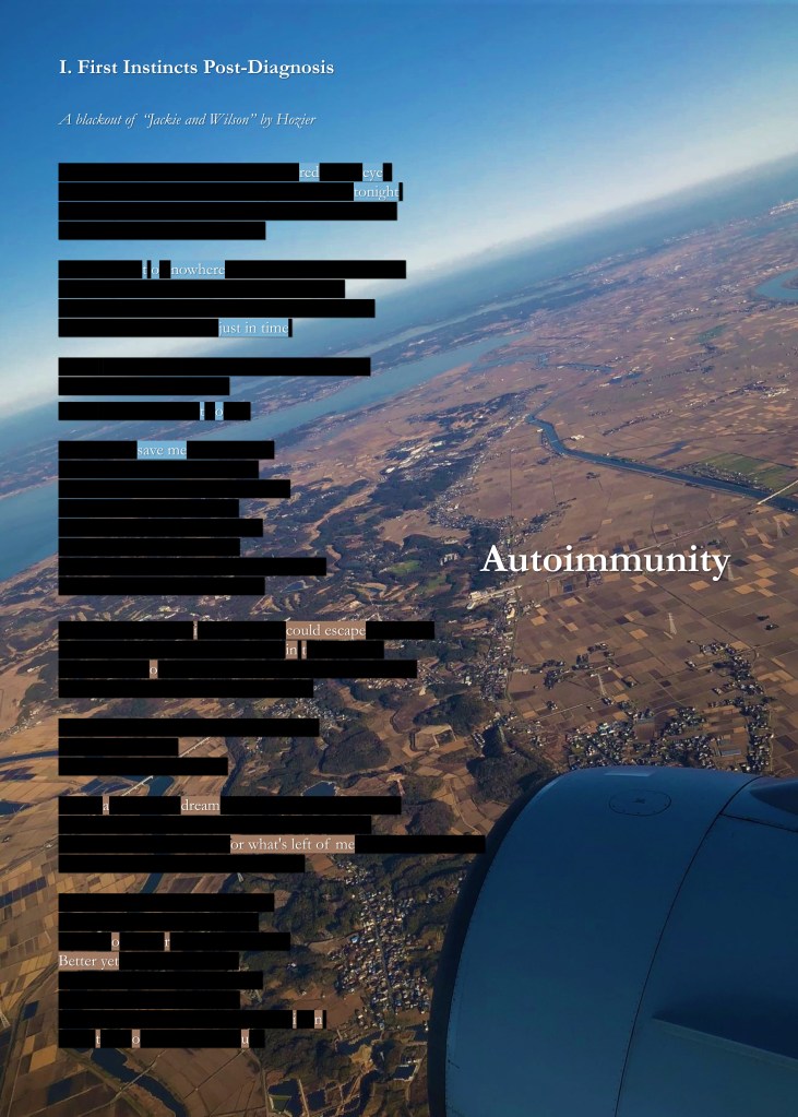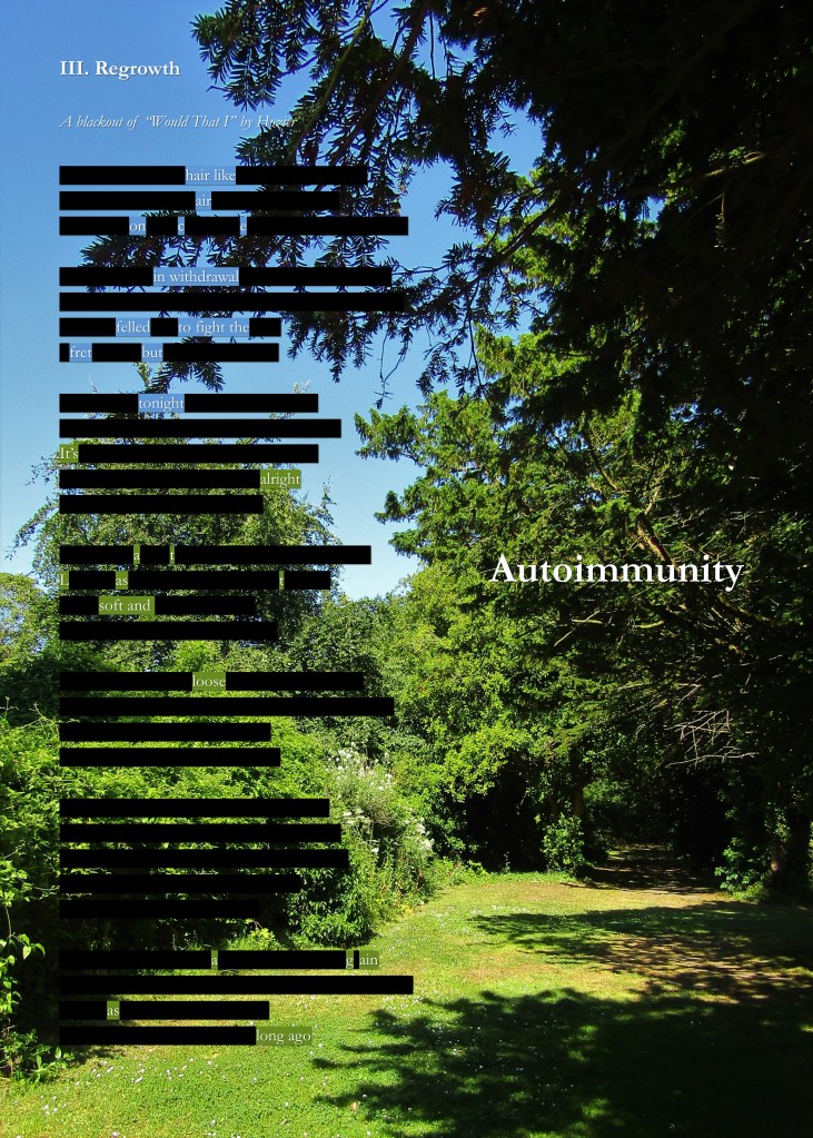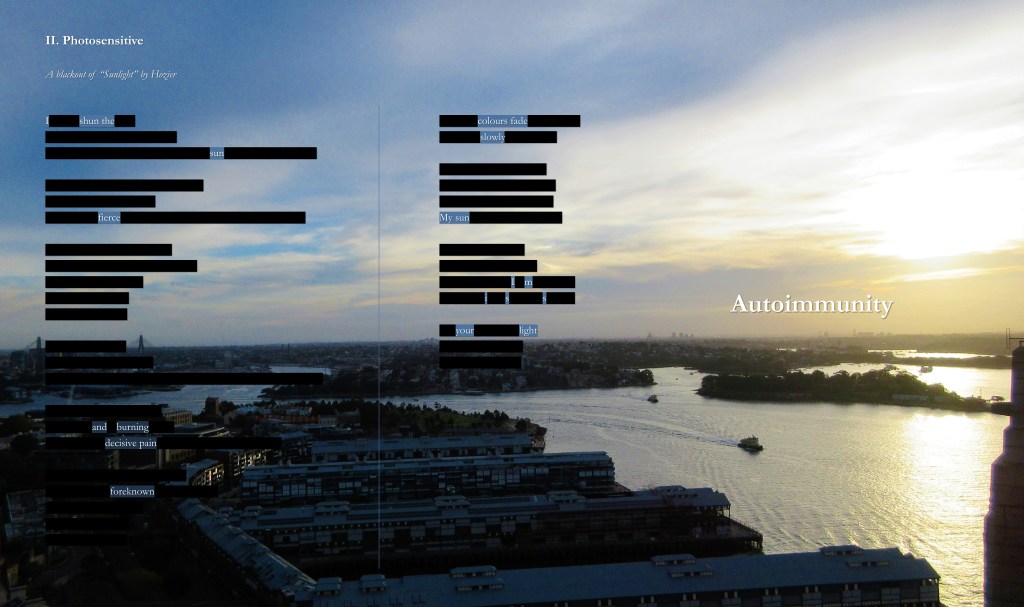 So that turned into “II. Photosensitive,” although at the time, it was just “Photosensitive,” because I thought it would be a standalone piece. “I. First Instincts Post-Diagnosis” and “III. Regrowth” came into being that same day as two more standalone pieces, when it occurred to me just how much I enjoyed that creative process, in the midst paying tribute to my favorite singer-songwriter. But it wasn’t until about three weeks later when I relooked the work and figured I wanted a more cohesive narrative running across all three pieces that it became “Autoimmunity” as it is here.