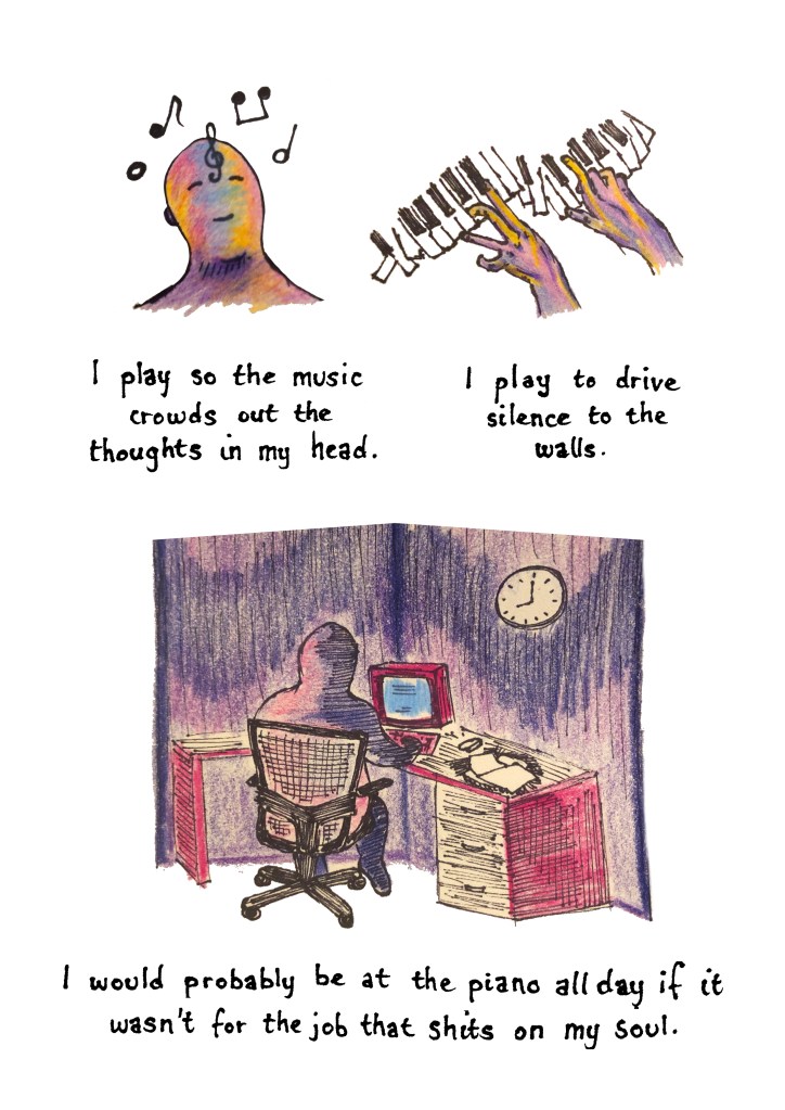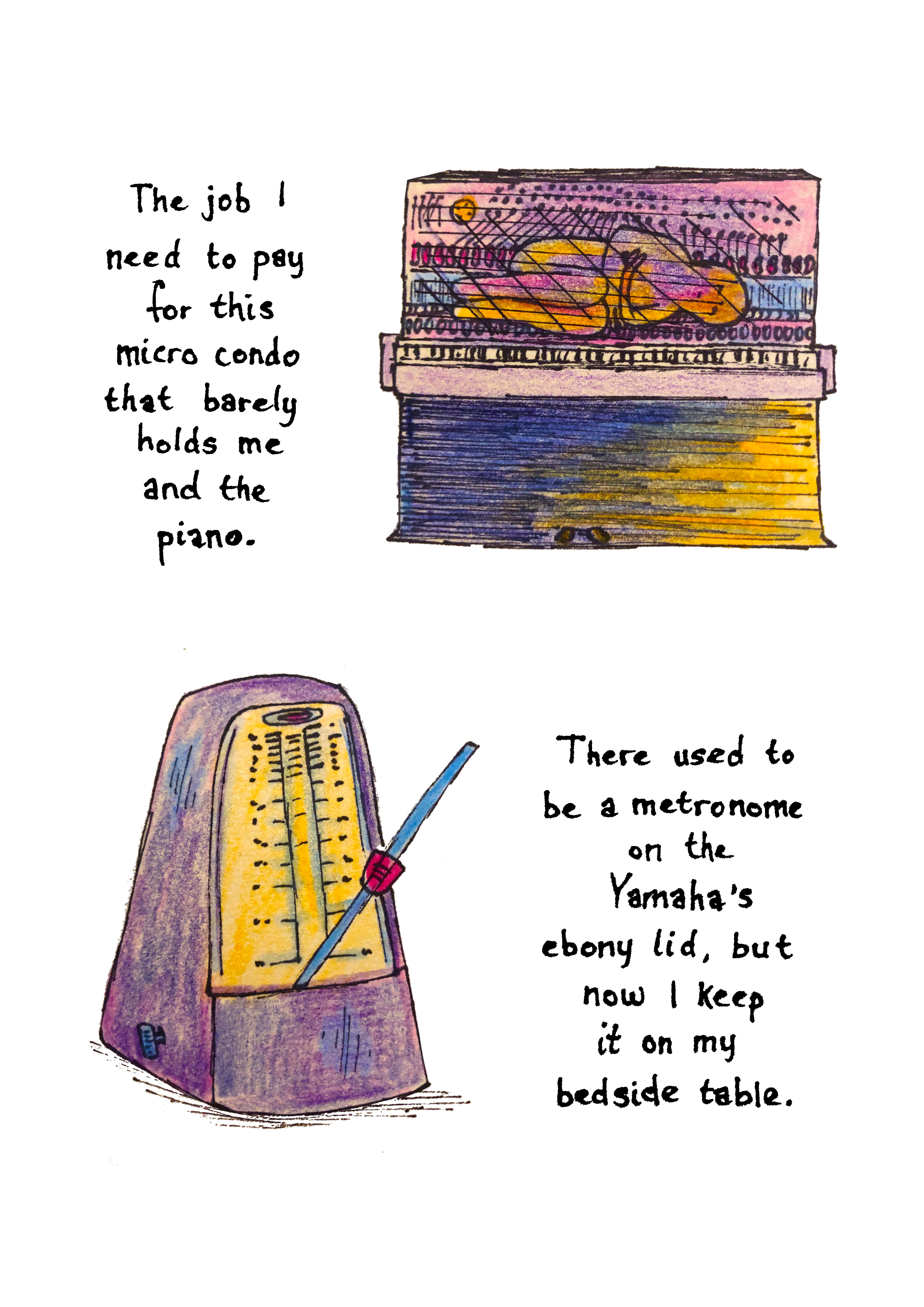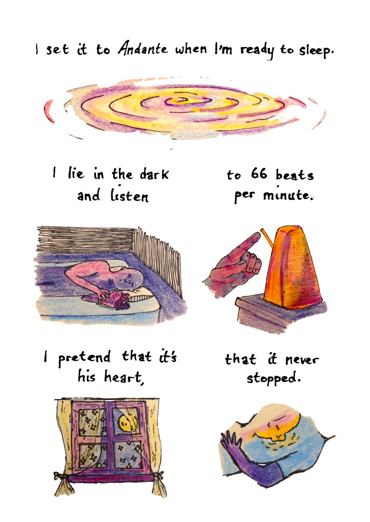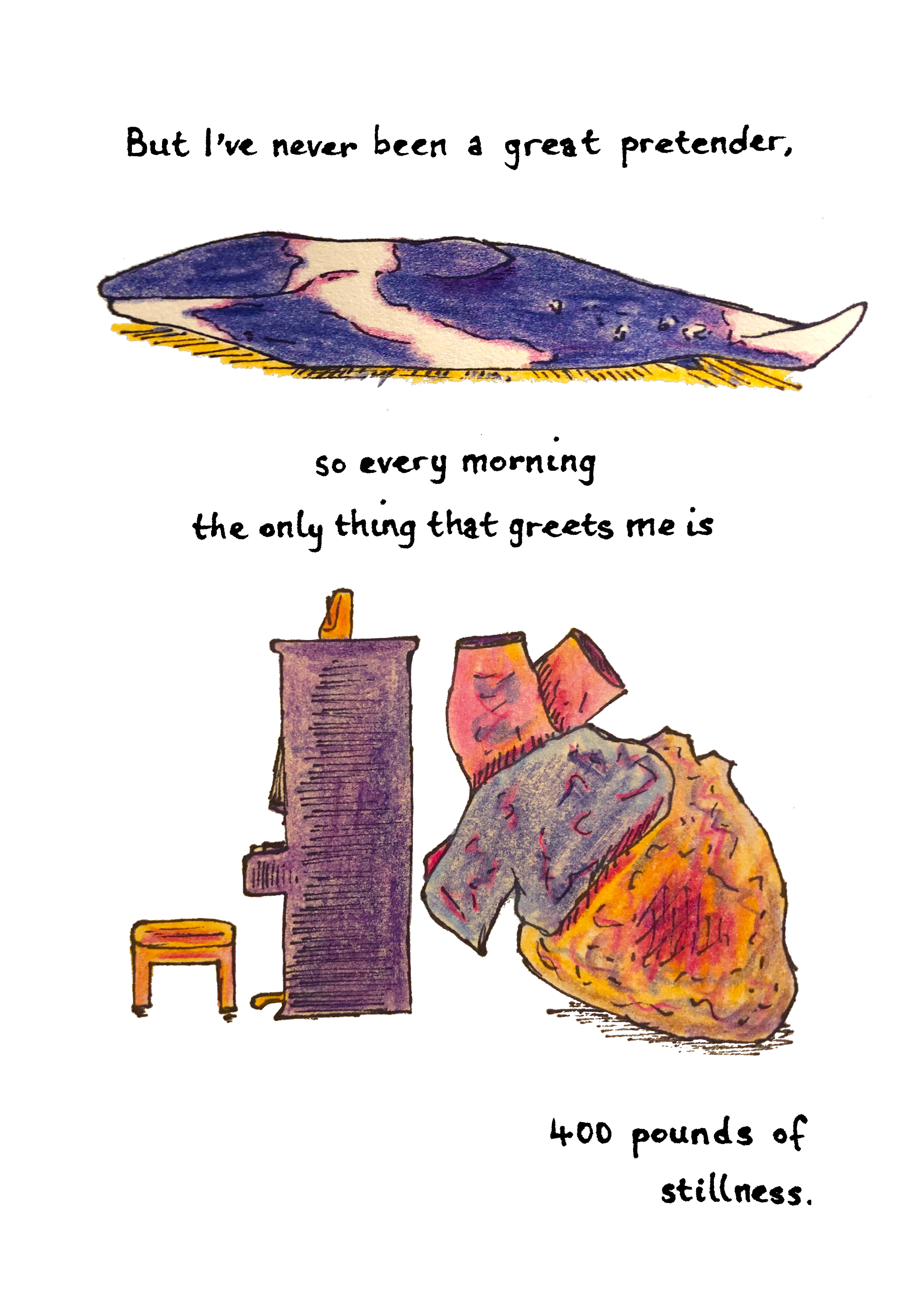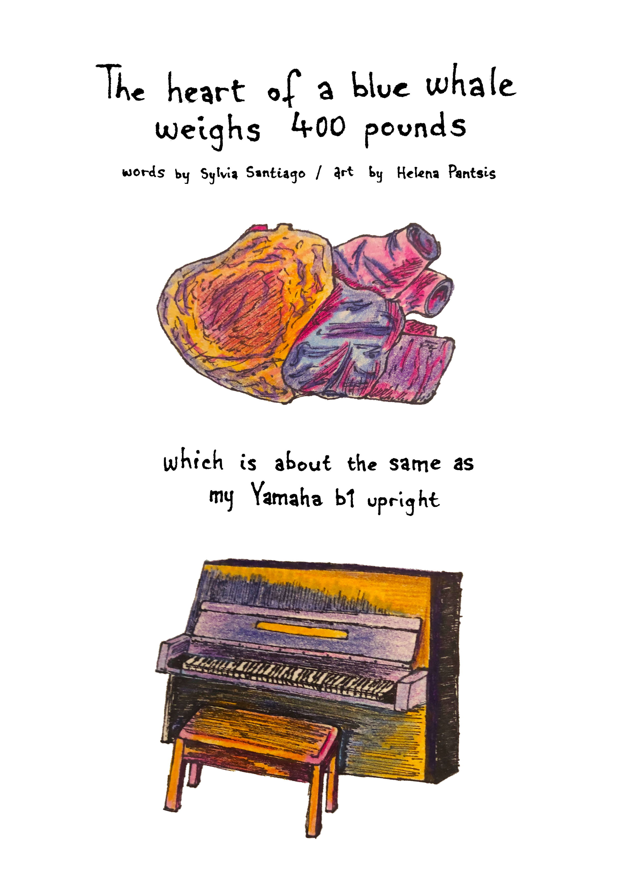 SS: “The heart of a blue whale weighs 400 pounds” was drafted in a workshop shortly before I saw Helena’s post. I was familiar with her comics from online journals; there’s a candor to her illustrations that I was drawn to. I’m thrilled with what she created for this piece.